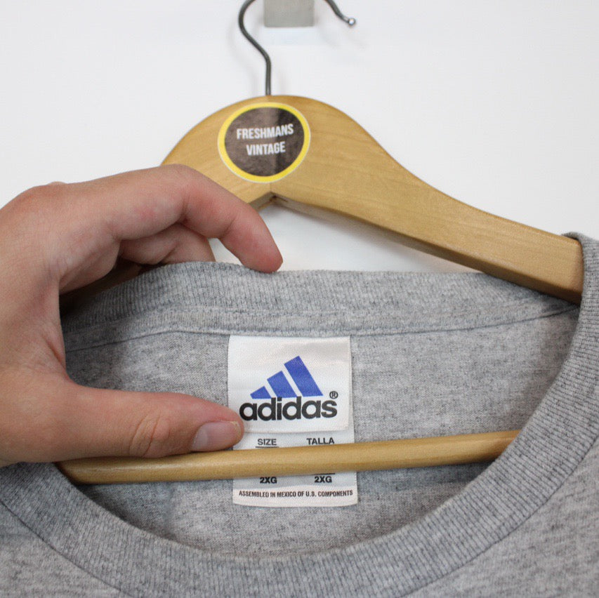 Vintage 90's Adidas Grey Crew Neck Spellout Short Sleeve T-Shirt Size on label: XXL Our recommended size: XXL Pit to pit (inches): 27 Length (inches): 30 All products listed are vintage unless stated otherwise in the description. These items are pre-loved and pre-worn, resulting in small signs of wear and fading. We think this adds to their unique authenticity, but if an item has any major flaws these will be stated. - The t-shirt does have a mark to the back of the right sleeve, this is reflected in the price Please contact us if you have any further questions!