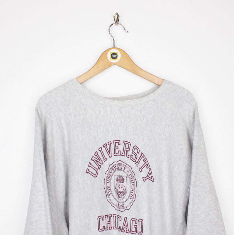 Vintage 90's Champion Light Grey University of Chicago USA Crew Neck Sweatshirt Jumper - in very good worn condition, has the embroidered Champion logo on the sleeve and printed spellout. - men's size XXL, 25 inches pit to pit and 31 inches length