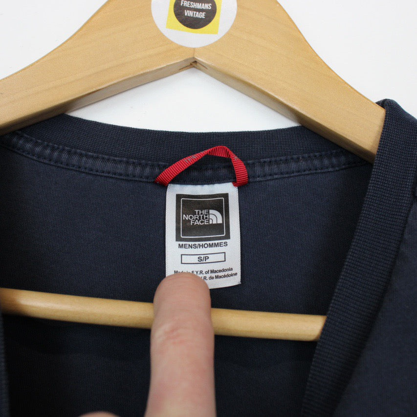 Vintage The North Face Navy Blue and White Crew Neck Short Sleeve T Shirt 🗣 - in good worn condition, has some minor fading and cracking to the logo - men's size Small, 19 inches pit to pit and 26 inches length
