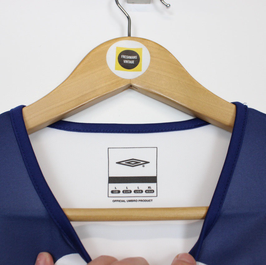 Vintage Umbro White and Navy Blue Short Sleeve T-Shirt Size on label: Large Our recommended size: Large Pit to pit (inches): 21.5 Length (inches): 28.5 All products listed are vintage unless stated otherwise in the description. These items are pre-loved and pre-worn, resulting in small signs of wear and minor fading. We think this adds to their unique authenticity, but if an item has any major flaws these will be stated below. Please contact us if you have any further questions!